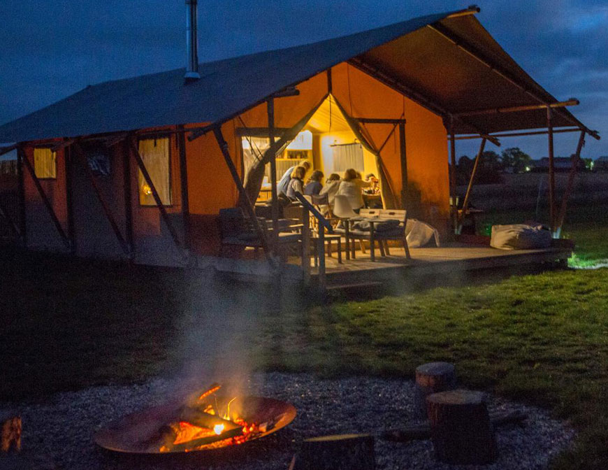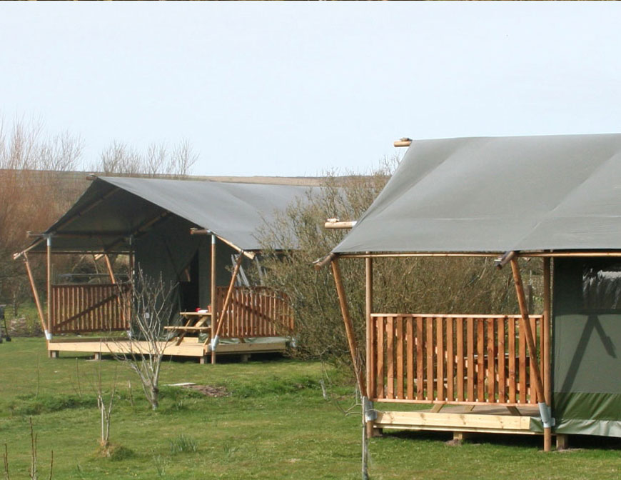 The 2 storey Safari tents have two bedrooms and sleep a maximum of 5 people. A wonderful four poster bed, appointed with authentic mosquito netting, really does set the scene. On the first floor, you'll find three single beds, in a cosy layout with great landscape views. Camping with a real home from home feels - you'll find a microwave with grill facility, kettle, induction hob and even a TV in the lounge area.
